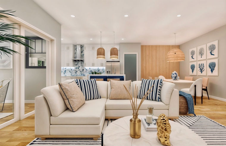 I created this coastal-inspired space for a stunning house. I'm proud to showcase the beautiful kitchen, living room, dining room, sun room, master bedroom and master bathroom which feature elegant and functional decoration elements. You'll be inspired by the relaxed yet sophisticated ambiance that this space provides.